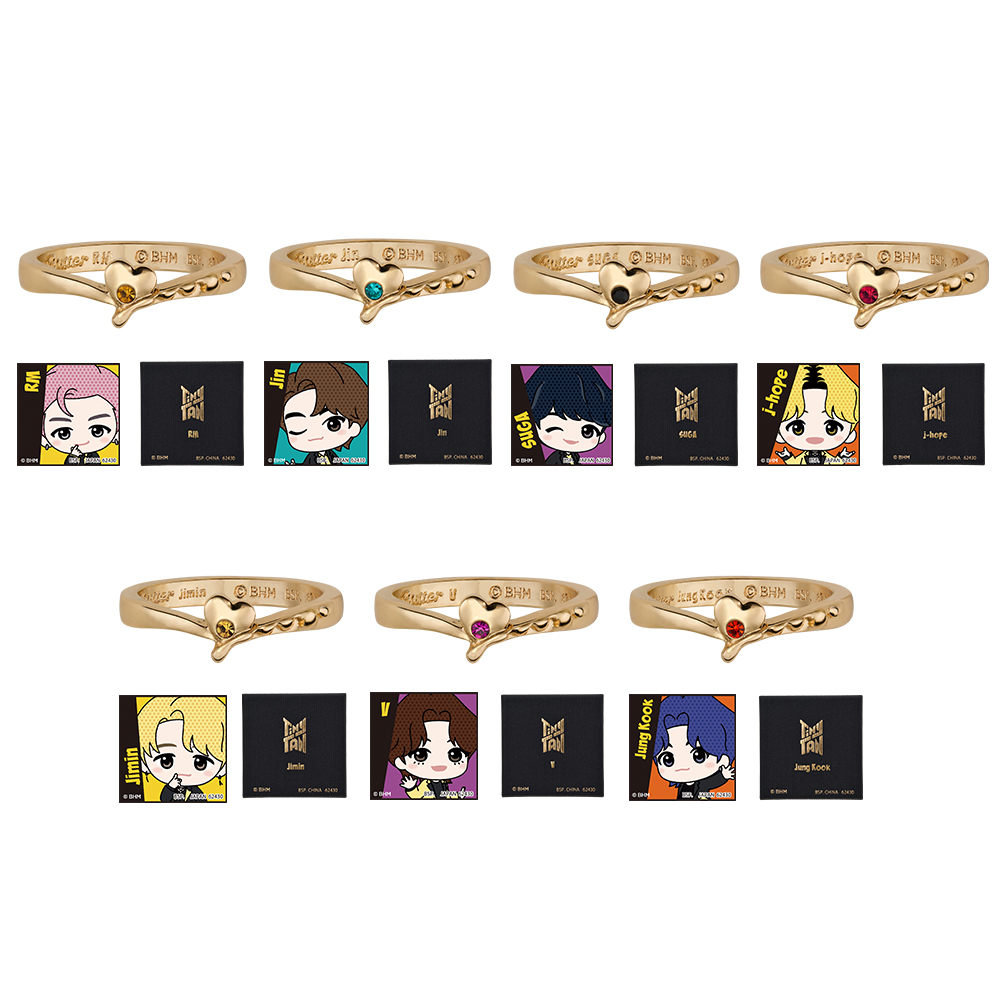 ハート型のbutterがゆるりと溶けているゴールドカラーのデザインがButterの楽曲を象徴しています。リングの内側にはButterのロゴとキャラクターの名前が刻印されています。キャラクターの名前が入ったBOXに入り、オリジナルアートのカードと一緒に飾って楽しむこともできます。